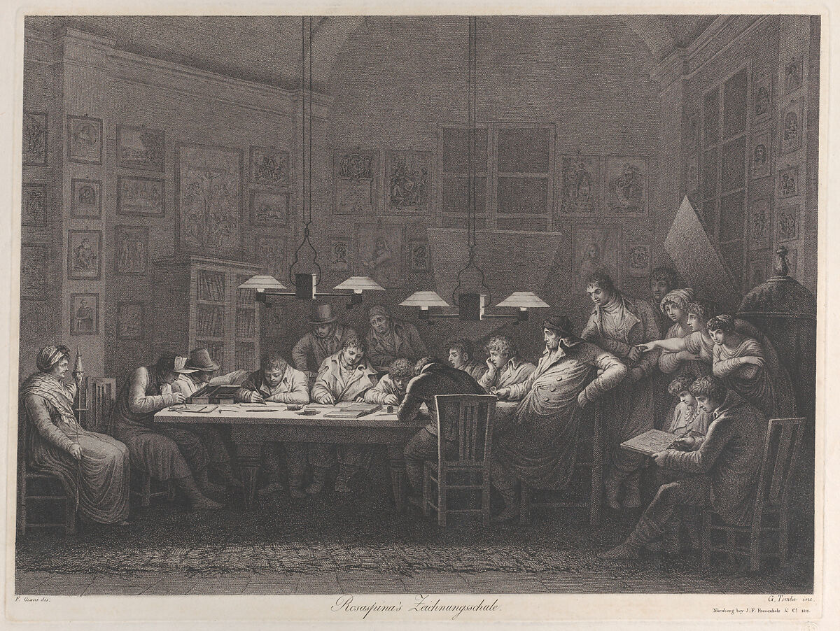 - Title: Rosaspina's drawing academy: class of students sketching seated around a table with Rosaspina at the end of the table with women and other spectators
