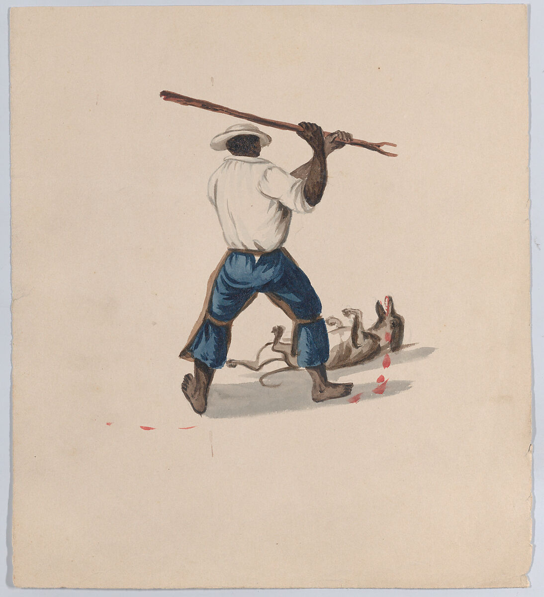 A man viewed from behind beating a dog with a stick, from a group of drawings depicting Peruvian dress
