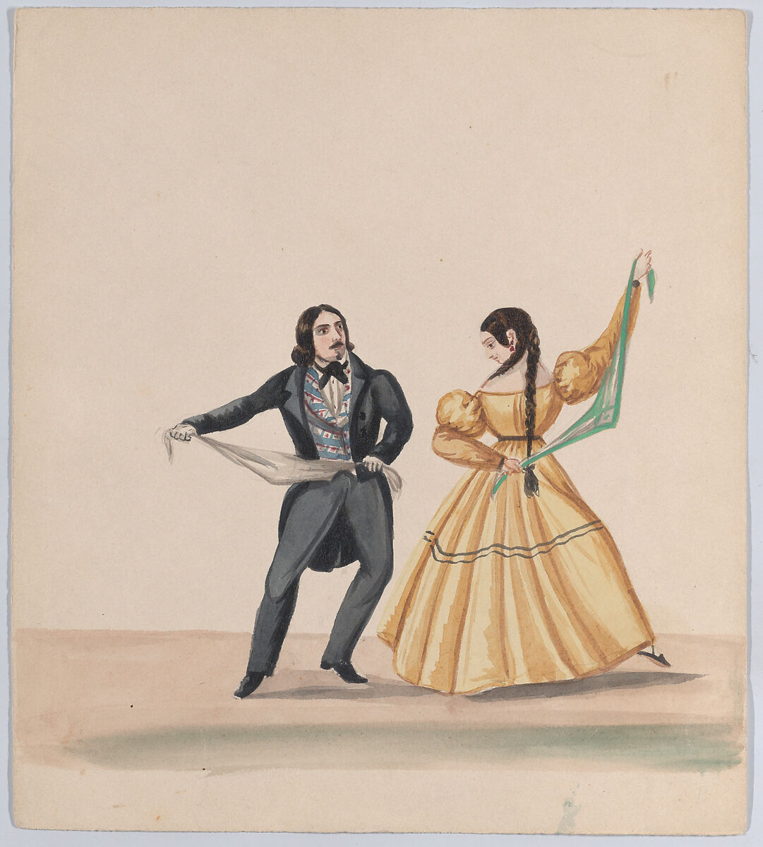A man and a woman dancing, from a group of drawings depicting Peruvian dress