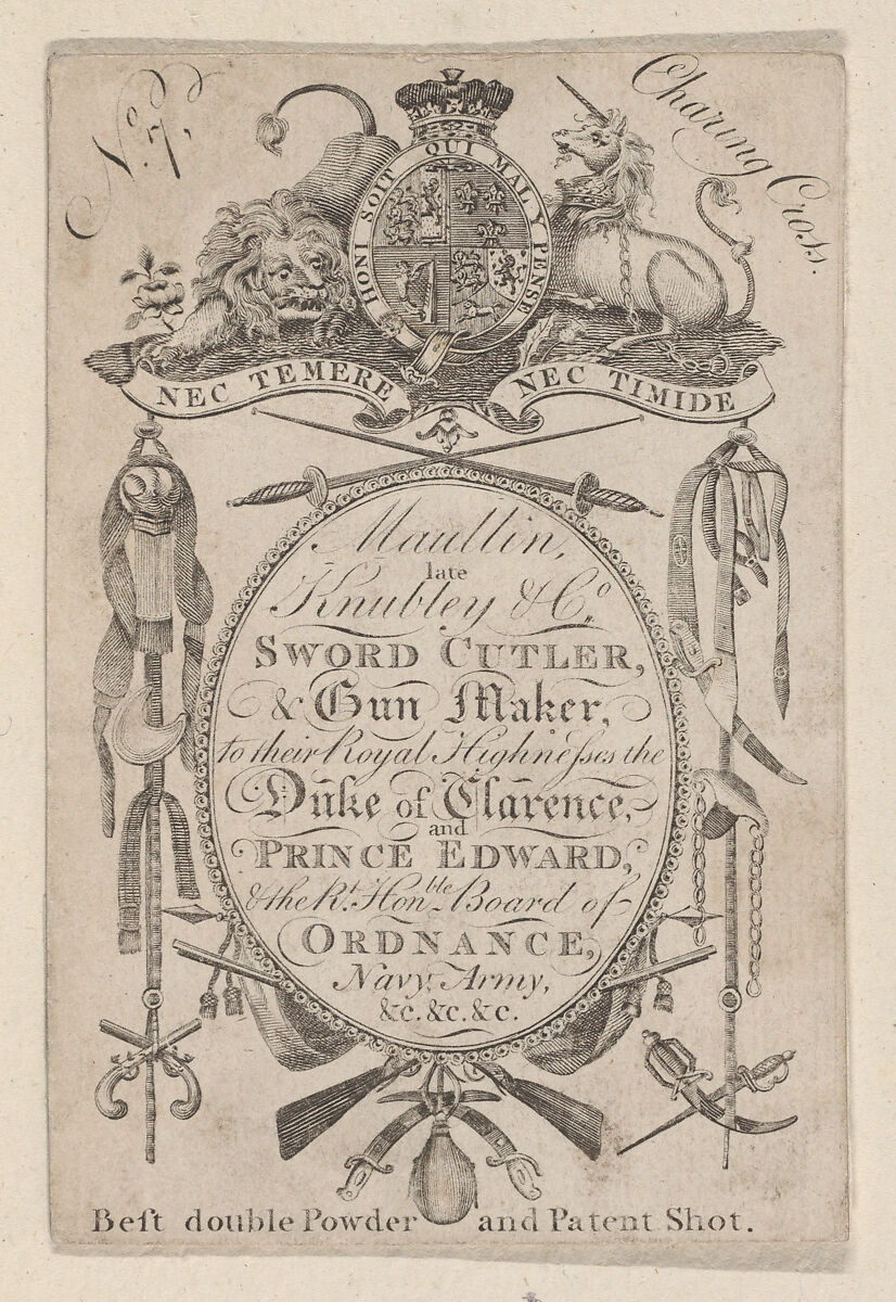 In the late eighteenth century, craftsmen in London used customized engraved trade cards, similar to the modern-day business card, as a means of advertising their services and qualifications to potential clients. This trade card bears the name of John Knubley, gunmaker to the Prince of Wales and other members of the royal family. Knubley is believed to have trained and employed Samuel Brunn, the gunmaker responsible for the pair of silver-mounted Neoclassical pistols also in the Museum’s collection (1992.330.1, .2). The card, issued after Knubley’s death, was likely created by local businessman John Maullin, whose name appears on the card above Knubley’s. Maullin may have printed the card in anticipation of taking over Knubley’s business at No. 7 Charing Cross, a transaction that archival records indicate never came to pass.