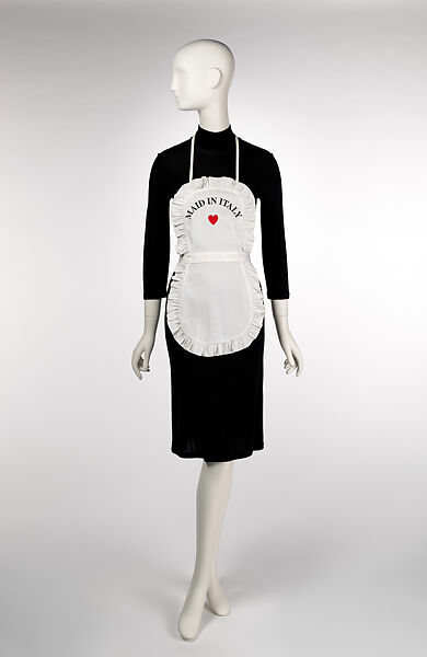 This "Maid in Italy" dress by Rosella Jardini, playfully evokes the uniform of a housemaid with the characteristic wit that the house of Mochino has come to be associated with. It was featured as the opening look for the autumn/winter 2001-2 Cheap and Chic show, which featured a cast of models that role-played a day in the life of a fashionable woman. From maids carrying breakfast trays, dusters, and other cleaning accoutrements, women in silk lounging pajamas with curlers in their hair, to the chic day suits that a professional might wear to the office, the narrative humorously unfolded with the presentation of each new ensemble. Jardini worked closely alongside the founder throughout his lifetime, and from his death in 1994 to her departure in 2013, Jardini assumed responsibility as the creative director of the Italian fashion brand, seamlessly perpetuating Franco Moschino’s legacy. This ensemble employs several Moschino leitmotifs: the use of parody and archetype; incorporation of trompe l’oeil design details with the sewn-in-one apron; and perhaps most significantly the employment of double entendre.