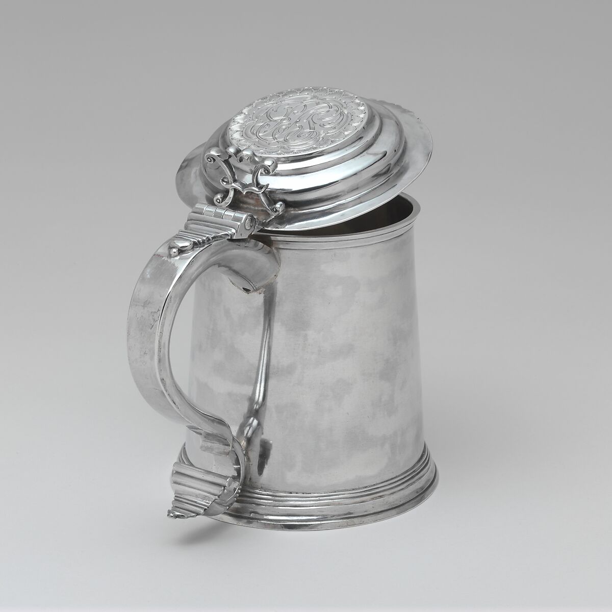 This tankard is marked by silversmith Thomas Hamersley, whose surviving work often emulates contemporary English design. The exceptionally fine engraving was probably executed by an immigrant craftsman trained abroad, as was the case with many engravers in mid-eighteenth-century New York. The present tankard belonged to New York merchant Samuel Broome (1734–1810), who married Phebe Platt (1739–1814) on June 27, 1763. Because the cover of the tankard features the couple’s intertwined initials—SPB for Samuel and Phebe Broome—the tankard could well have been commissioned to celebrate their marriage. Phebe was the sister of one of Samuel’s business partners, Jeremiah Platt, who, along with Samuel and Samuel’s younger brother John, operated a lucrative import-export business.