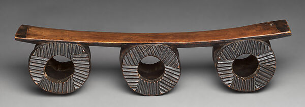 The earliest headrests preserved in museum collections are those created in ancient Egypt during the Middle Kingdom, ca 2030 B.C. A remarkable diversity of styles of related forms were developed by different cultural groups across southern Africa. Nguni sculptors from present-day South Africa are especially recognized for the inventiveness of their headrest designs. This bold yet simple interpretation elegantly balances a horizontal surface that spans three carefully spaced sets of circular discs emblazoned with dense graphic motifs.