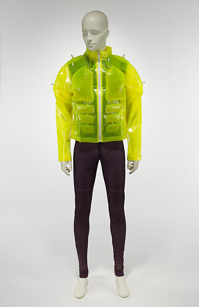 Walter Van Beirendonck's inflatable "He-Man" torso jacket was shown as part of his Killer / Astral Travel / 4D-Hi-D collection for spring/summer 1996, which was a powerful statement against the ravage caused by the AIDS epidemic. The collection came out under the label "W.&L.T.," or Wild & Lethal Trash, in collaboration with the denim brand Mustang. The motto for these youthful collections was "Kiss The Future," a concept translated in high-tech materials, bright colors and cartoonish graphics, appropriated from rave culture. Van Beirendonck contrasted childlike references with exaggerated masculine characteristics, symbolizing how the AIDS epidemic created violence through innocent love and sexuality. The use of plastics referred to latex and safe sex as ways to prevent HIV infection.