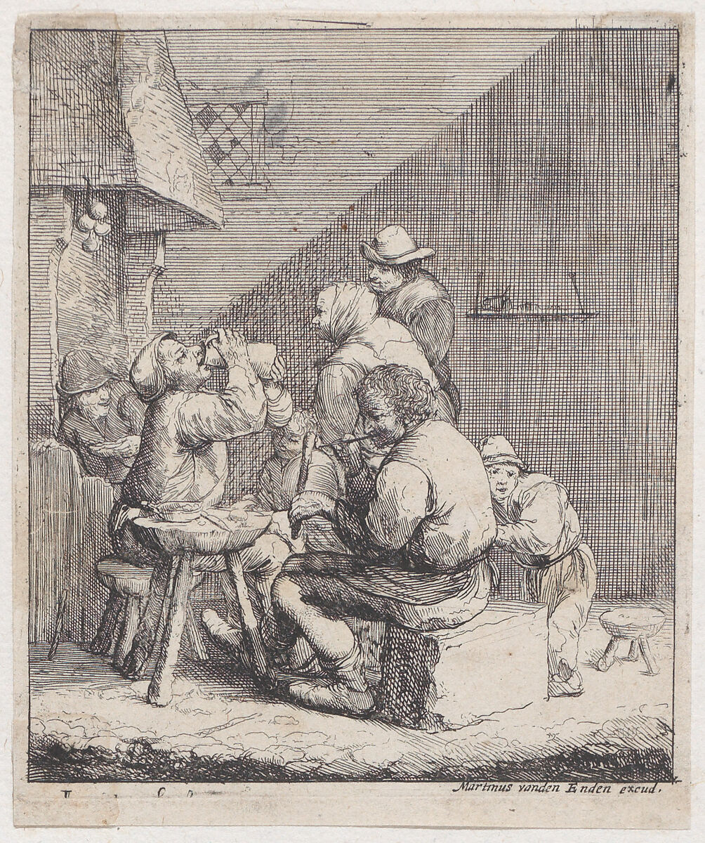 - Title: Seven peasants in a rustic interior with a man lighting a pipe