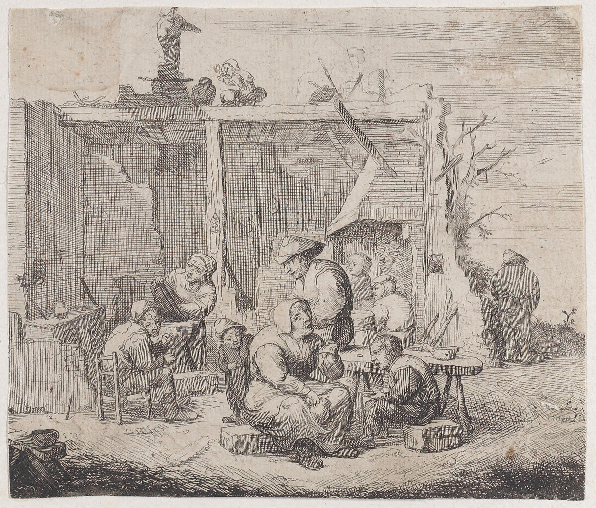 A dilapidated building with eight peasants engaged in various activities