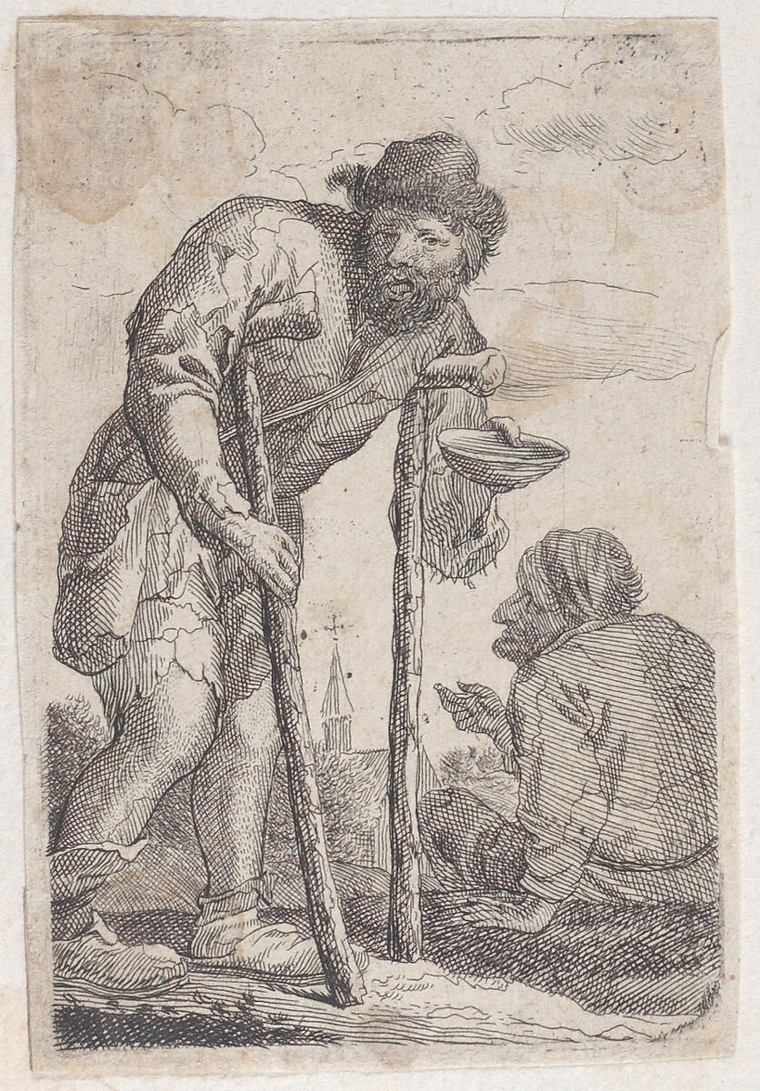 - Title: A beggar on crutches holding out a bowl