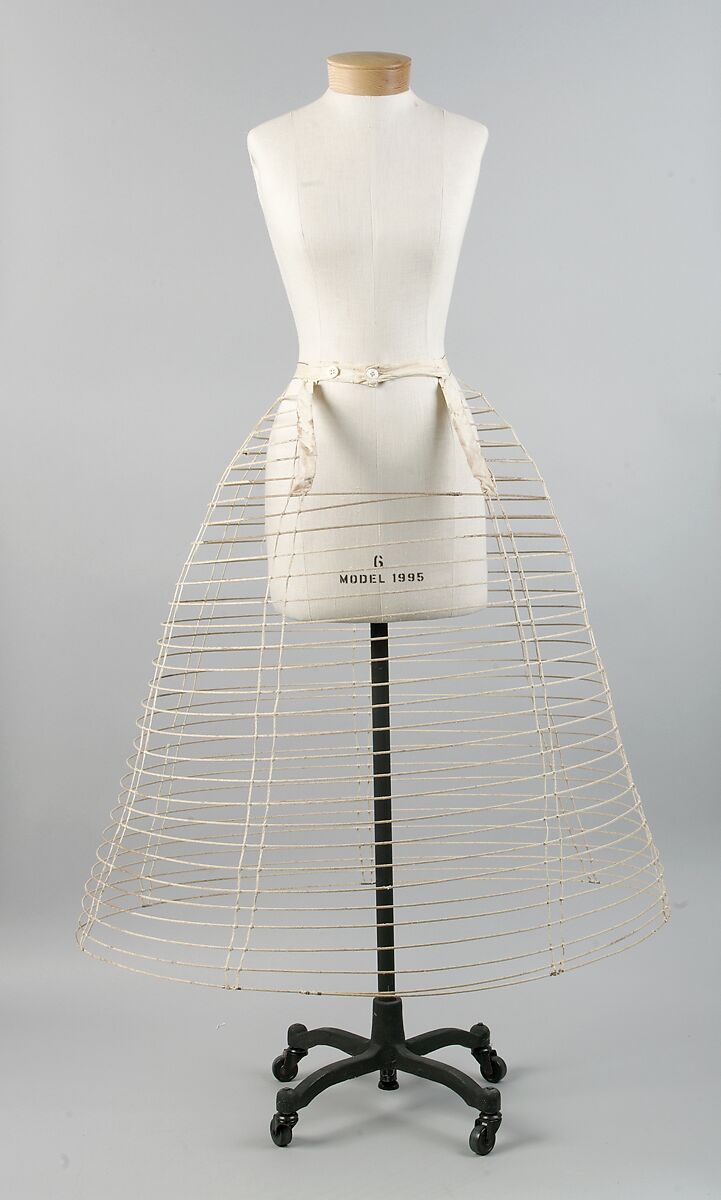 This petticoat is made from metal wire and cotton tape. It would have been covered with an additional fabric petticoat to protect the dress worn over it. The hooping of cage crinolines could be made of whalebone, cane, or steel. The concentric skeleton of the cage would be held together with cloth tapes or it could be wholly encased in fabric. The expanse that could be achieved with this understructure was even greater than that provided by eighteenth-century panniers.