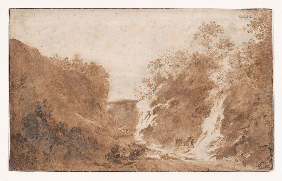 Brown wash beautifully evokes the subtle play of light on the rocks and foliage in this landscape that depicts a road on the outskirts of Brussels. The Dutch artist Jan de Bisschop drew almost exclusively in brown wash along with lines of pen and brown ink. He employed this technique in numerous copies of earlier works of art but he used it as well to render landscape. He probably created this drawing during a trip to Flanders in 1649. A small piece of paper inscribed in an early hand "buyten Brussel" (outside of Brussels), is attached to the verso of this sheet. A number of other drawings related to this trip that depict the area around Brussels are known. De Bisschop was a lawyer by trade but he mingled with an elite circle of intellectuals and artists in The Hague where he had set up a law practice in 1652.