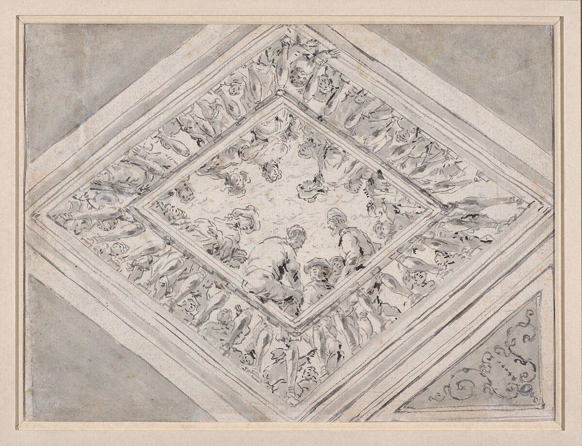 - Title: Ceiling Design with Figures along a Lozenge-Shaped Balustrade (recto); Alternative Design with Groups of Figures along a Lozenge-Shaped Window (verso)