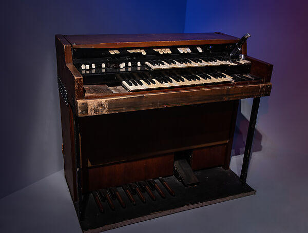 This work of art is currently on loan to the museum.This Hammond L-100 organ was Keith Emerson's stunt instrument. During improvisations, he would stick knives between its keys to hold down notes, jump on it, and pull it on top of himself. His technicians specially modified the L-100 to withstand these destructive performances and also added pitch-bending capabilities. The organ was retired after it burst into flames during a performance.