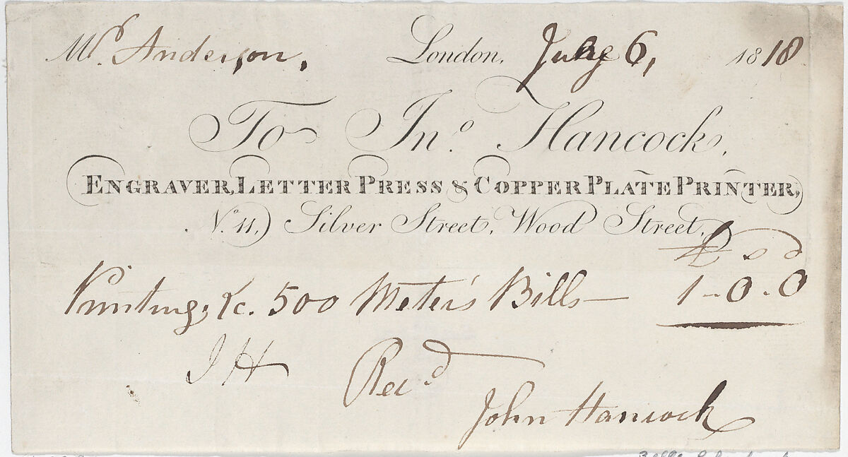 Trade Card for John Hancock, Engraver, Letter Press & Copper Plate Printer