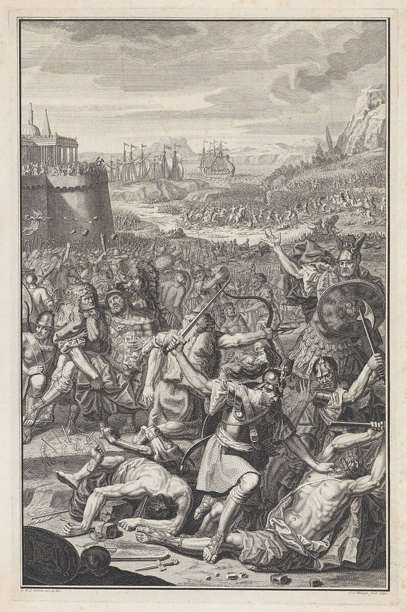 - Title: Battle scene with a man about to be stabbed with a sword at lower right