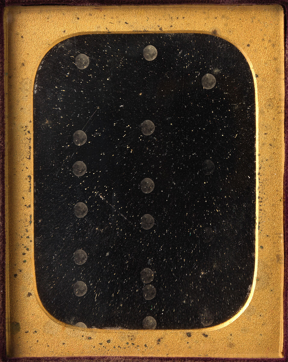 Eighteen tiny yet detailed impressions of the moon, captured by means of multiple exposure, dot the metal surface of this recently discovered daguerreotype. It was likely made in England by the Frenchman Antoine-François-Jean Claudet. One of the first studio daguerreotypists in London, Claudet experimented with recording ephemeral natural phenomena, including electricity, clouds captured instantaneously, and the sun viewed through fog. The plate is housed in a case bearing the 1846-52 London studio address of John Jabez Edwin Mayall, who worked as an assistant to Claudet in 1846. Claudet’s well-documented scientific experiments with photography—he exhibited a lunar daguerreotype at the 1851 Great Exhibition—make him the more likely author of this image.