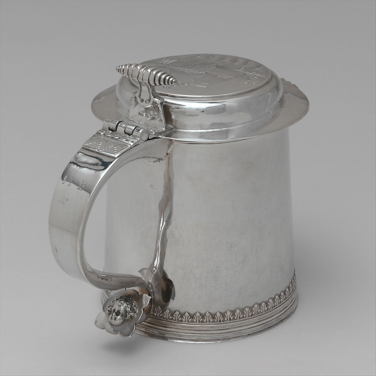 In 1698, Giles Shelley (1664–1710), a New York City merchant and sea captain, sailed in command of the ship Nassau for Madagascar, a favorite haunt of Captain Kidd and his pirates. Shelley returned to New York with a vast amount of treasure but, suspected of complicity with Kidd, he was arrested on a charge of piracy. He was later released and lived for many years, a wealthy and respected merchant. This tankard was probably presented to Shelley by the merchants who financed his enterprise. The handsomely engraved coat of arms is that of the Shelley family, and the scene on the cover depicts a thirty-two-gun ship, possibly the Nassau.