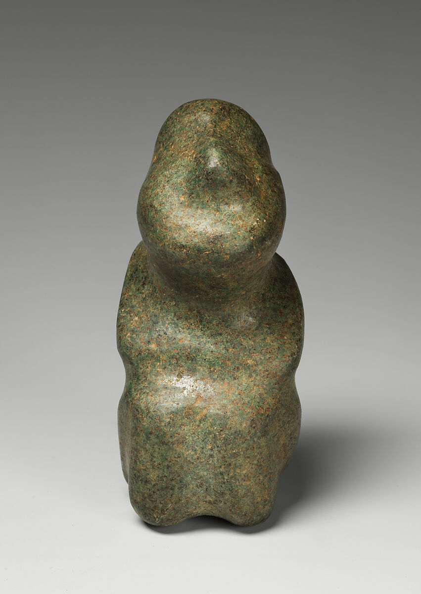 While most West Mexican artists drew inspiration from their lively communities and the natural world around them, Mezcala artists developed a highly stylized and conceptual approach to sculpted images of persons, animals, and buildings (see MMA 1979.206.1208, 1994.35.633). The simplified human figures they created are depicted wearing neither clothing nor ornamentation of any kind. They show no indication of gender, group identification, social position, or even any sign of whether they might represent earthly humans or spiritual beings.