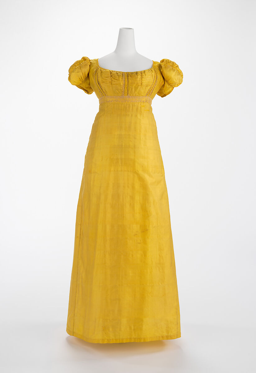 After the body consciousness and transparent fabrics of the Empire style, fabrics took on more weight. At first, plain silks in vivid colors imitated the simple lines of musin dresses. It was not long, however, before the plain gown began to be accented with intricate contrasting applied decoration.