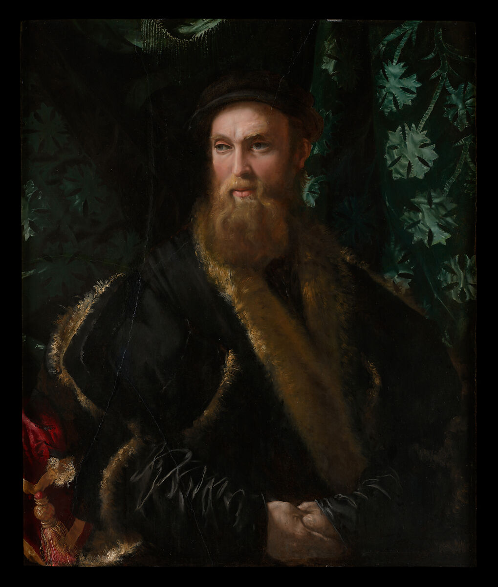 Having made politically astute loans to popes, the Venetian state, and French monarchs, Bindo Altoviti was one of the wealthiest and most powerful bankers of the sixteenth century. Born in Rome to a Florentine father, Altoviti divided his time between the two cities. His likeness was recorded in his youth by Raphael and, several years after this painting, in bronze by Benvenuto Cellini. This sumptuous portrait—executed at the height of Altoviti’s career—is painted on marble, a support used in Rome, where Salviati must have acquired the skill for it. However, the tactility of the heavy curtain, fur trims, silks, and velvets feels more Venetian than Roman or Florentine.