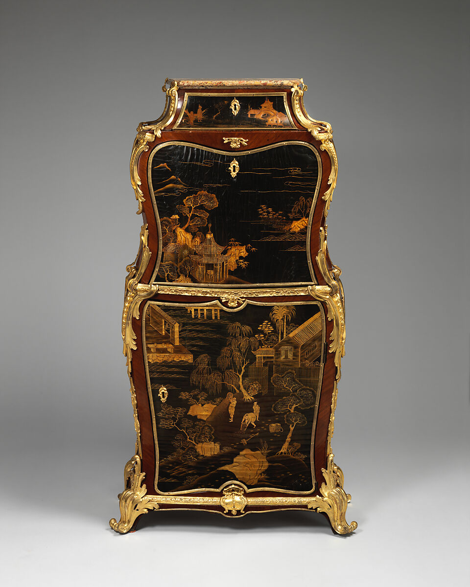 - Medium: Veneered on oak, in front with panels of black and gold lacquer, partly Chinese and partly European, and on the sides with floral marquetry in tulipwood, rosewood, satinwood, purplewood, and various other end-cut woods; mounts of gilded and chased bronze; top of breche d'Aleps marble