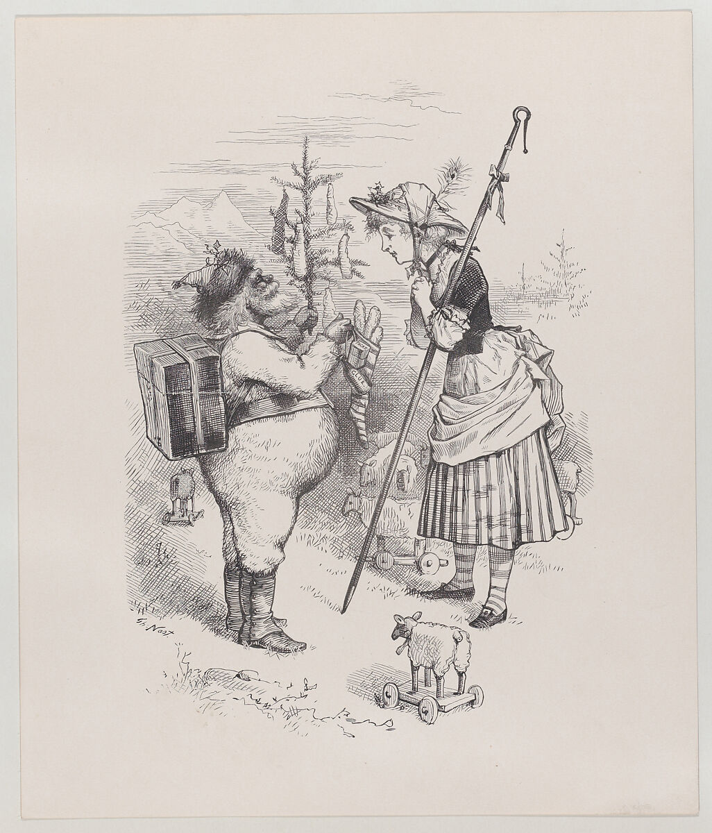 Santa dressed in a fur suit and with a box strapped to his back offers a stocking filled with lamb's tails to Little Bo Peep, as well as tacks and glue. The shepherdess at right holds a crook and is surrouned by toy sheep on wheels that lack their tails. A fir tree hung with more tails is shown behind the figures. The related wood engraving was published in the 1879 Christmas issue of Harper's "Young People." In 1862 Nast combined European traditions of St. Nicholas with folk images of elves from his native Germany to create the enduring image of a jolly gift-giver that we now so firmly associate with Christmas. Initially conceived as a way to cheer readers during the American Civil War, here Santa converses with a Nursery Rhyme character to entertain children.