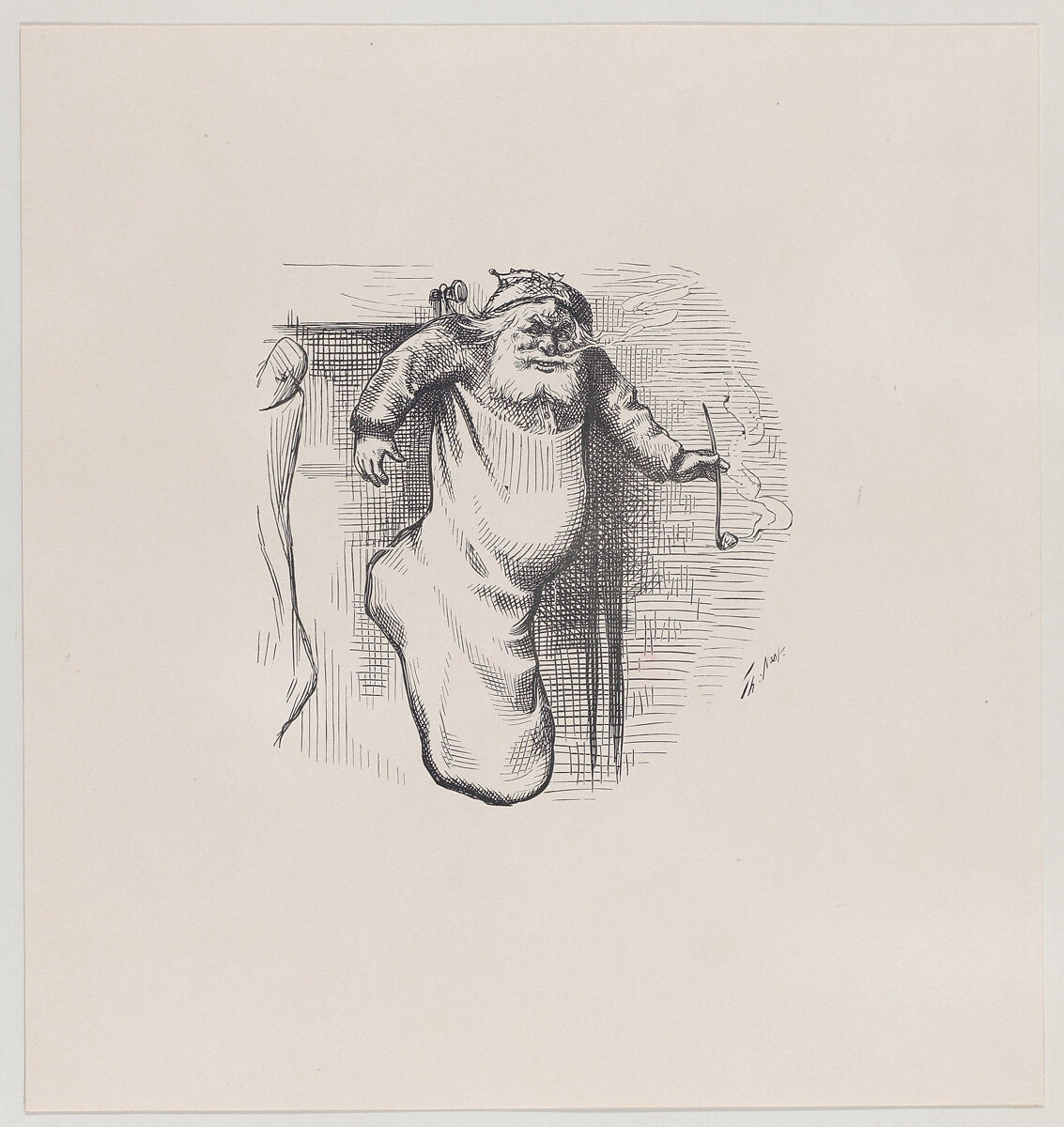 Santa Claus rests in a stocking suspended from a mantle while smoking an old-fashioned long-handled pipe. In 1862, during the dark days of the American Civil War, Nast combined European traditions of St. Nicholas with folk images of elves from his native Germany to create the enduring image of a jolly gift-giver that we now so firmly associate with Christmas. This proof of a wood engraving that Harper's Weekly issued January 4, 1879 shows how small Nast's Santa was. The published version of the image adorned on a page of holiday advertisements.
