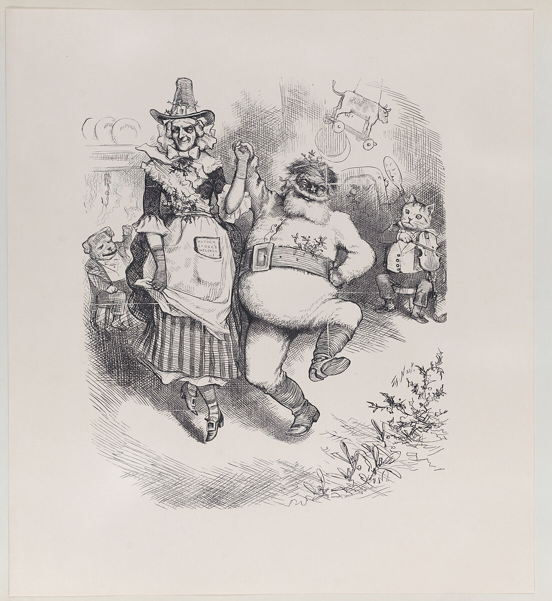 Santa dressed in a fur suit with a wide belt into which are tucked pieces of mistletoe, holds hands with Mother Goose to dance in an interior. The "Cat and the Fiddle" provides music and a "Little Dog" seated next to roaring fire laughs to see such fun. The related wood engraving appeared on the cover of Harper's Weekly, January 3, 1880.
