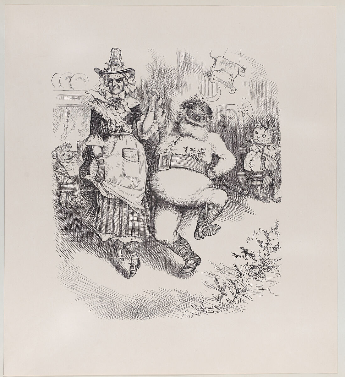 Santa dressed in a fur suit with a wide belt into which are tucked pieces of mistletoe, holds hands with Mother Goose to dance in an interior. The "Cat and the Fiddle" provides music and a "Little Dog" seated next to roaring fire laughs to see such fun. The related wood engraving appeared on the cover of Harper's Weekly, January 3, 1880.