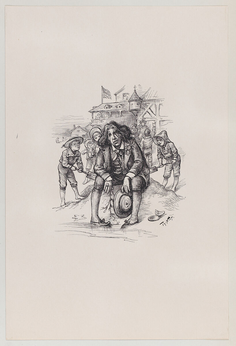 Oscar Wilde dressed in aesthetic garb sits dejectedly on a sand pile by the water's edge, as puzzled children holding look at him. He holds a strand of seaweed. This is a proof of a wood engraving published in Harper's Bazar. In the latter publication, this text was printed below: "Oscar at the Sea-Shore. Young America: “Come, let’s bury him in the sand and put him out of his misery.”