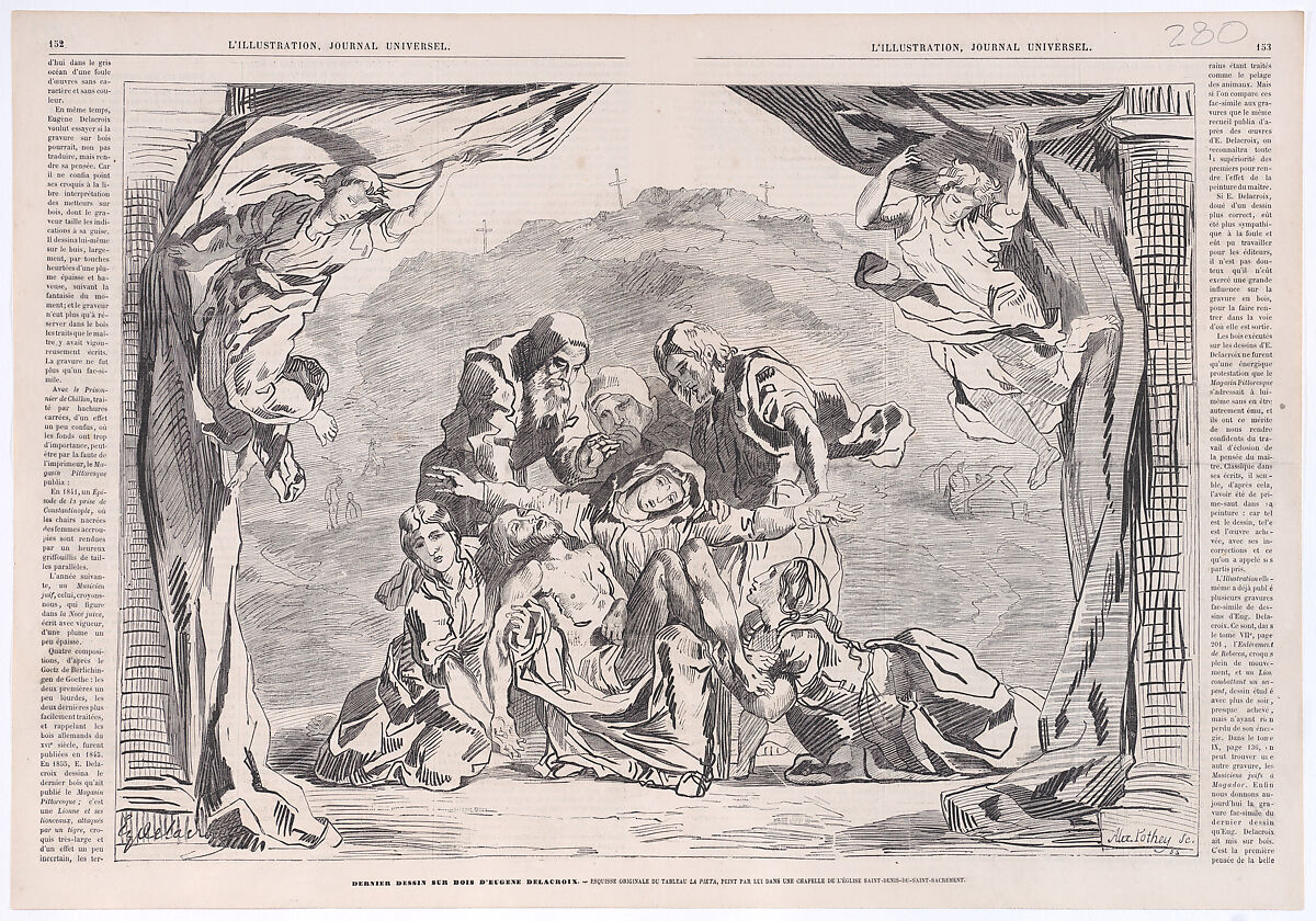 Published just two weeks after the death of Delacroix, this print is described as the artist's "last drawing on wood." Customarily, to make a wood engraving, an artist would supply a drawing on paper to be translated by another hand onto the wood block, before being engraved by yet another practitioner. By drawing directly onto the wood himself, Delacroix believed the medium could serve as an outlet for the direct expression of his thought. This composition corresponds more closely with Delacroix's first oil sketch (private collection) for his Pietà than the final mural executed in Saint-Denys-du-Saint-Sacrement, which does not include the angels and reverses the figural group.