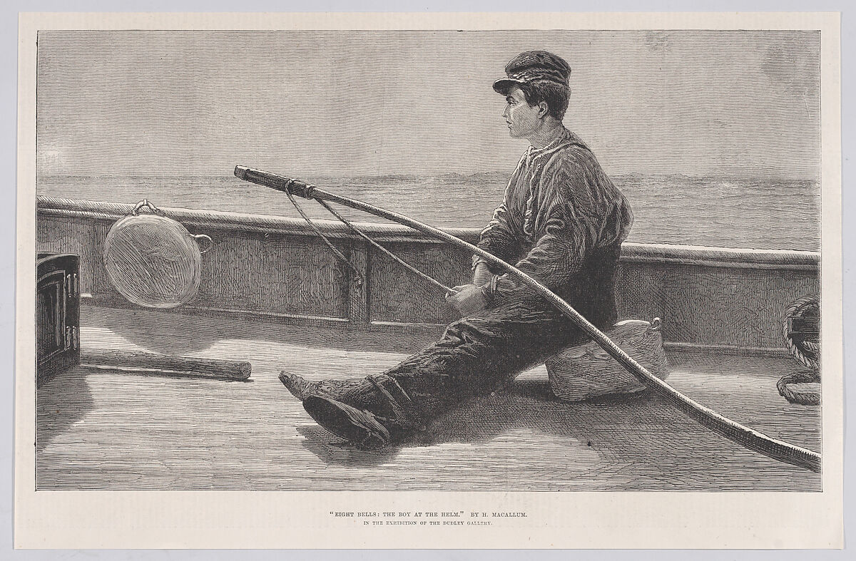 Macallum moved to London from Glasgow, after training in a merchant's office for what his father hoped would be a commercial career in India. Instead, the young man escaped to London in 1864 to study at the Royal Academy Schools. This print suggests that he had achieved a solid reputation by 1876. An accomplished sailor, the artist used a small yacht to sketch subjects in western of Scotland and Devon. Eight bells is the nautical term for twelve o'clock and we here see a youth left to tend the tiller at noon, presumably as his shipmates eat lunch. The slack line indicates a light breeze and little danger.