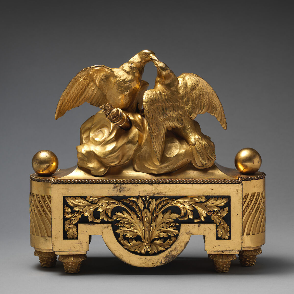 The kissing doves on clouds bursting with quivers, torches and a wreath of roses give these firedogs a distinct love theme. In 1780, the bronze worker François Rémond supplied a pair of firedogs of this model to the Comte d’Artois. It was used in one of the private rooms at the Chàteau de Bagatelle, the pleasure pavilion built for Comte d’Artois in the Bois de Boulogne, Paris. The original provenance of this particular pair is unknown.
