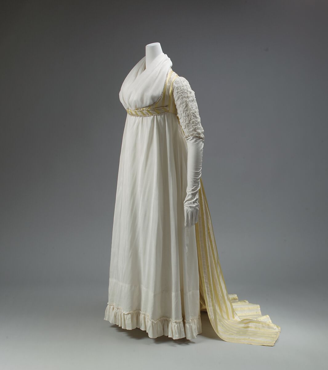 The Empire dress owes its name, physical emancipation, popularity, and even its sexiness to France. In this English example, French style is slavishly followed in the gown's high waist and modish stripes. But for all its classicizing details and shape, the gown retains vestiges of the ancien régime in its open-robe construction.