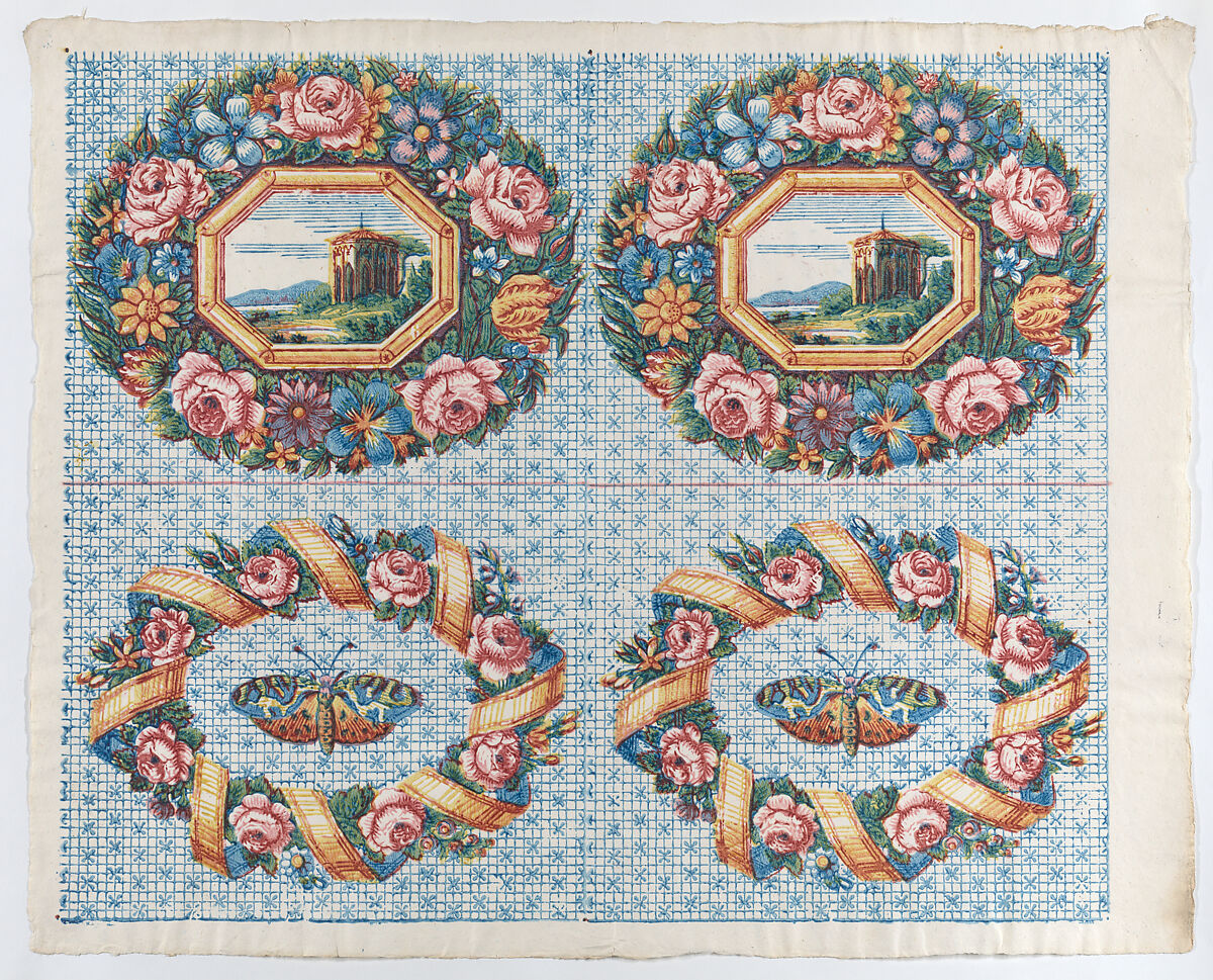 - Title: Sheet with two borders with a landscape and moth within wreaths