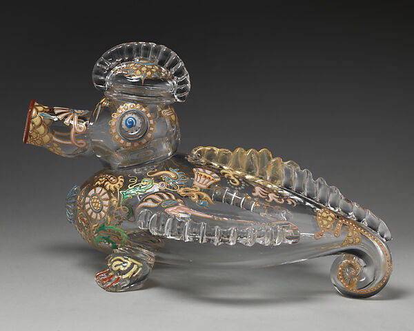 This work of art is currently on loan to the museum.This highly peculiar zoomorphic vessel, produced by the glass company Thomas Webb & Sons, is likely a one-off prototype. No multiples appear to have been made for retail. Its enameled polychromy and naïve shape depart from the refined, etched and carved cameo glass for which the firm is better known. Was this creature simply too weird, even for the broadly minded collectors of the Aesthetic Movement?