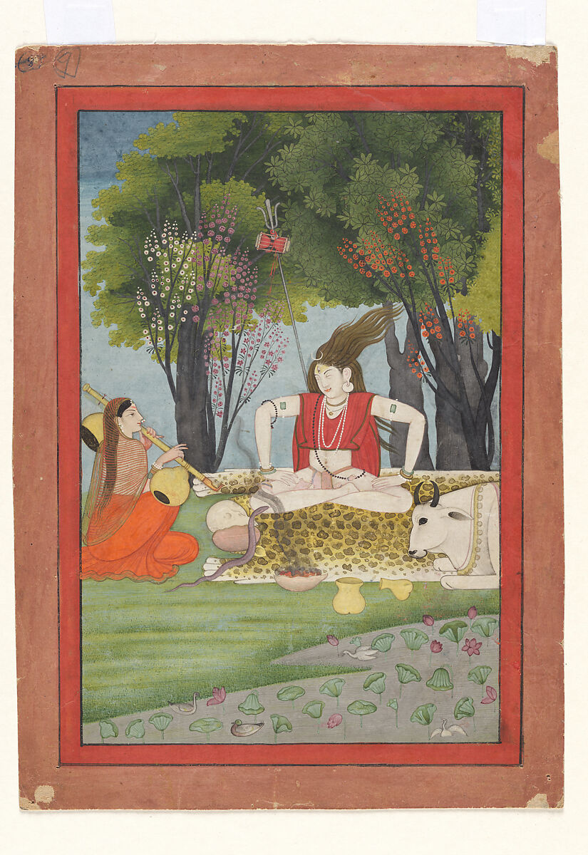 In this remarkable painting we see an encounter between Shiva, his eyes closed in deep meditation, and his wife Parvati, who attempts to arouse him by playing a vina as she gazes upon her lord in the hope that he might respond to her overtures. Shiva stirs, gazing with his third eye, drawn by the beauty of her playing. But his anger at being disturbed is vividly conveyed by his posture: his hands defiantly on his thighs, his arms akimbo, and his elbows sharply projecting. The artist employs a clever device to further express Shiva’s fury—he represents Shiva’s long ascetics’ hair flying skyward as if caught in a mighty gale. This detail, in what is otherwise a becalmed pastoral setting in which smoke from a bowl of smoldering embers drifts off in the opposite direction, indicates that it is Shiva’s anger that propels the braids of his hair to fly upward. This painting belongs to a long, highly refined stylistic tradition that evolved in the Punjab Hills of northern India, known as the Pahari (Hill) Schools. Numerous sub-schools have been identified in recent connoisseurship studies, placing this work in the atelier of a smaller hill state, Guler.