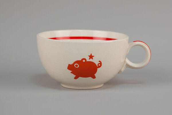 Viktor Schreckengost was a most prolific and influential industrial designer, who enjoyed a long career during the 20th century. He was literally born into the ceramics industry, in Sebring, Ohio, where his father worked at a ceramics factory. Schreckengost studied at the highly influential Cleveland School (now the Cleveland Institute of Art), graduating in 1929, and launching into a successful career, both designing and teaching. By the mid-1930s Schreckengost had already established his fame as a ceramic sculptor. He also worked as a designer in the tableware industry, and by that time had begun designing it in a modernist mode, providing designs for both the forms and the decoration. One of his most successful, was his “Manhattan” shape, with its rounded, ample, simple, and spare forms, with unornamented rims. Its very name, “Manhattan,” implies modern, urban life. The shape was conceived as a vehicle for transfer-printed decoration, allowing for new designs to be issued annually. In about 1935 the American Limoges China Company (later Sebring Pottery), where he serve as artistic director, introduced his Animal Kingdom line on “Manhattan” forms. It features various simplified animal motifs—humorous stylized designs of elephants, donkeys, pigs, squirrels, and fish, each accompanied by a carefully placed star. The designs were not hand-decorated, but rather were applied with decals. In many ways the chubby and cheerful silhouettes in vibrant colors are almost childishly naïve.