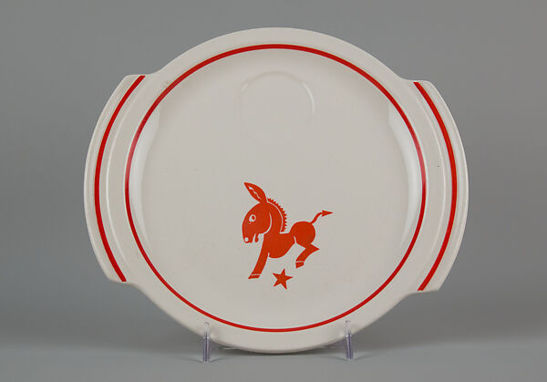 Viktor Schreckengost was a most prolific and influential industrial designer, who enjoyed a long career during the 20th century. He was literally born into the ceramics industry, in Sebring, Ohio, where his father worked at a ceramics factory. Schreckengost studied at the highly influential Cleveland School (now the Cleveland Institute of Art), graduating in 1929, and launching into a successful career, both designing and teaching. By the mid-1930s Schreckengost had already established his fame as a ceramic sculptor. He also worked as a designer in the tableware industry, and by that time had begun designing it in a modernist mode, providing designs for both the forms and the decoration. One of his most successful, was his “Manhattan” shape, with its rounded, ample, simple, and spare forms, with unornamented rims. Its very name, “Manhattan,” implies modern, urban life. The shape was conceived as a vehicle for transfer-printed decoration, allowing for new designs to be issued annually. In about 1935 the American Limoges China Company (later Sebring Pottery), where he serve as artistic director, introduced his Animal Kingdom line on “Manhattan” forms. It features various simplified animal motifs—humorous stylized designs of elephants, donkeys, pigs, squirrels, and fish, each accompanied by a carefully placed star. The designs were not hand-decorated, but rather were applied with decals. In many ways the chubby and cheerful silhouettes in vibrant colors are almost childishly naïve.