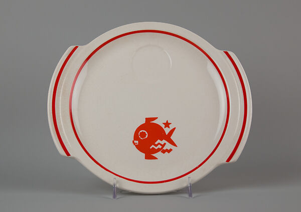 Viktor Schreckengost was a most prolific and influential industrial designer, who enjoyed a long career during the 20th century. He was literally born into the ceramics industry, in Sebring, Ohio, where his father worked at a ceramics factory. Schreckengost studied at the highly influential Cleveland School (now the Cleveland Institute of Art), graduating in 1929, and launching into a successful career, both designing and teaching. By the mid-1930s Schreckengost had already established his fame as a ceramic sculptor. He also worked as a designer in the tableware industry, and by that time had begun designing it in a modernist mode, providing designs for both the forms and the decoration. One of his most successful, was his “Manhattan” shape, with its rounded, ample, simple, and spare forms, with unornamented rims. Its very name, “Manhattan,” implies modern, urban life. The shape was conceived as a vehicle for transfer-printed decoration, allowing for new designs to be issued annually. In about 1935 the American Limoges China Company (later Sebring Pottery), where he serve as artistic director, introduced his Animal Kingdom line on “Manhattan” forms. It features various simplified animal motifs—humorous stylized designs of elephants, donkeys, pigs, squirrels, and fish, each accompanied by a carefully placed star. The designs were not hand-decorated, but rather were applied with decals. In many ways the chubby and cheerful silhouettes in vibrant colors are almost childishly naïve.