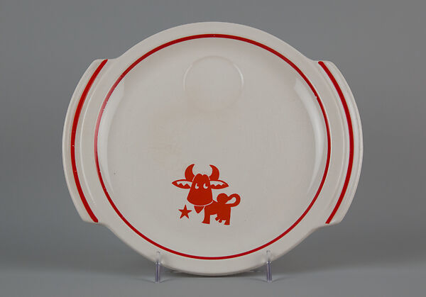 Viktor Schreckengost was a most prolific and influential industrial designer, who enjoyed a long career during the 20th century. He was literally born into the ceramics industry, in Sebring, Ohio, where his father worked at a ceramics factory. Schreckengost studied at the highly influential Cleveland School (now the Cleveland Institute of Art), graduating in 1929, and launching into a successful career, both designing and teaching. By the mid-1930s Schreckengost had already established his fame as a ceramic sculptor. He also worked as a designer in the tableware industry, and by that time had begun designing it in a modernist mode, providing designs for both the forms and the decoration. One of his most successful, was his “Manhattan” shape, with its rounded, ample, simple, and spare forms, with unornamented rims. Its very name, “Manhattan,” implies modern, urban life. The shape was conceived as a vehicle for transfer-printed decoration, allowing for new designs to be issued annually. In about 1935 the American Limoges China Company (later Sebring Pottery), where he serve as artistic director, introduced his Animal Kingdom line on “Manhattan” forms. It features various simplified animal motifs—humorous stylized designs of elephants, donkeys, pigs, squirrels, and fish, each accompanied by a carefully placed star. The designs were not hand-decorated, but rather were applied with decals. In many ways the chubby and cheerful silhouettes in vibrant colors are almost childishly naïve.