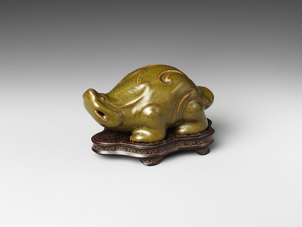 This water dropper has a similar look to the bronze water dropper in Japanese scholar Ichikawa Beian’s collection. Made of porcelain, it is an artful evocation of ancient bronze examples. The work also draws attention to the technical virtuosity of the potter, whose use of a greenish-brown glaze successfully mimics the patina of an ancient bronze. It is not coincidental that both Chinese and Japanese literati shared similar interests in stationery objects that have roots in archaic bronzes.