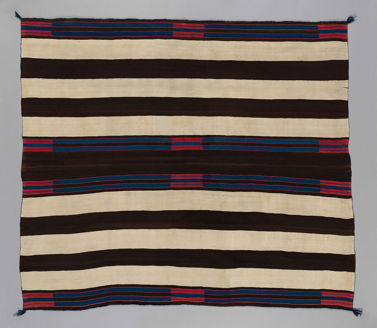 Weaving is an ancient form of visual expression, and the Indigenous peoples of the Southwest have been producing complex textiles for centuries. Navajo weavings were widely traded—for their aesthetic quality and use value—among neighboring groups, particularly in the Plains region. By the mid-nineteenth century, non-Natives were seeking out blankets and serapes as works of art and souvenirs. They were called "chief’s blankets" by both Native and Euro-Americans due to their high cost and importance. The term "second phase" is used by cultural historians and collectors to refer to weavings with red rectangles made between 1850 and 1880. "Third-phase" blankets are characterized by artful compositions of diamonds or cross formations, and date to between 1860 and 1880.This dynamic art form—a deeply rooted living tradition integral to Navajo culture—continues to flourish today through the efforts of a new generation of innovative weavers.