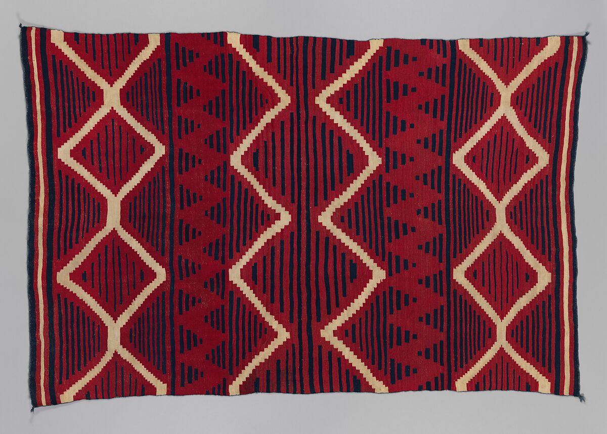 Serapes (the Spanish term for blanket) are a prominent form of Navajo weaving. In the early nineteenth century, they became seen as garments of prestige among a range of Southwest residents, as well as a high-value trade item. Vibrantly colored and vividly patterned, these so-called wearing blankets build on long-established design themes. The horizontal lines and diamond shapes of this classic example—referred to by some as a rare "radio-wave" pattern—are characteristic of Southwest Native American design, reflecting varied weaving traditions and artistic exchange among Native and Hispanic communities.