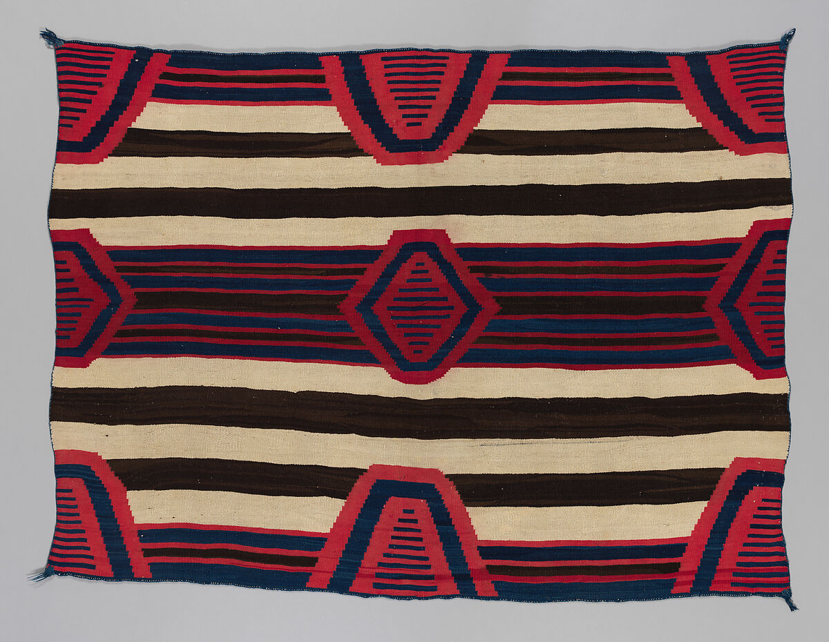 Weaving is an ancient form of visual expression, and the Indigenous peoples of the Southwest have been producing complex textiles for centuries. Navajo weavings were widely traded—for their aesthetic quality and use value—among neighboring groups, particularly in the Plains region. By the mid-nineteenth century, non-Natives were seeking out blankets and serapes as works of art and souvenirs. They were called "chief’s blankets" by both Native and Euro-Americans due to their high cost and importance. The term "second phase" is used by cultural historians and collectors to refer to weavings with red rectangles made between 1850 and 1880. "Third-phase" blankets are characterized by artful compositions of diamonds or cross formations, and date to between 1860 and 1880.This dynamic art form—a deeply rooted living tradition integral to Navajo culture—continues to flourish today through the efforts of a new generation of innovative weavers.