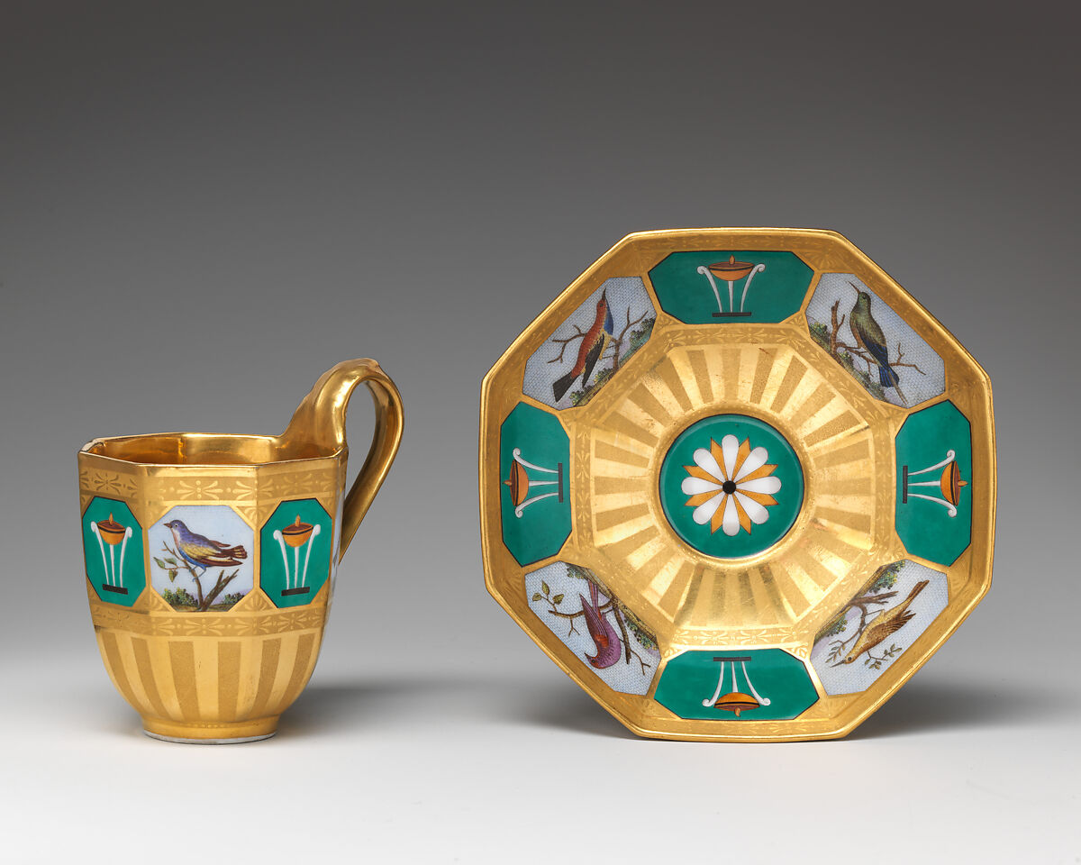 This cup and saucer demonstrates the fashion for antiquity and the influence that the Grand Tour had on porcelain productions at the royal porcelain manufactory in Berlin (Koenigliche Porzellan Manufaktur) in the early half of the nineteenth century. Beginning in 1806, the factory began producing wares in decorative patterns that imitated the micromosaic paintings made at Vatican workshops, which proved to be popular souvenirs among German travelers to Italy.