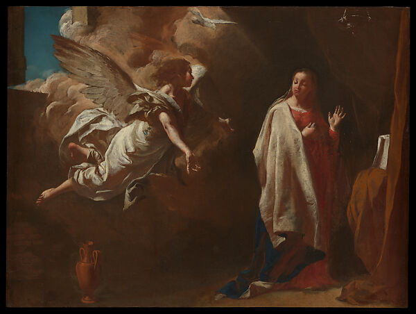 The traditional scene of the angel Gabriel announcing the birth of Jesus to Mary is rendered in brilliantly theatrical terms. The angel has flown into Mary’s humble bedchamber through an open window accompanied by the dove of the Holy Spirit; clouds billow around him; the shutter of the window opens toward the viewer; and a curtain at the right is as though drawn back to reveal the scene. The picture may be an independent work or a study for an altarpiece. Collectors prized bravura brushwork as a direct transcription of the artist’s creativity.