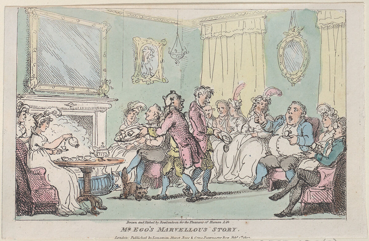 In an elegant drawing room, a plump man, Mr. Ego, gesticulates as he talks and holds a cup. His story has caused a footman to turn to listen and drop his tray, overbalancing another servant's plate of food. Other figures are seated in a semi-circle and a woman serves coffee or hot chocolate by a table at left next to a fireplace. Mounted with four other scenes designed and etched by Rowlandson: 59.533.1022(2, 4-6) and title page 59.533.1022(1).