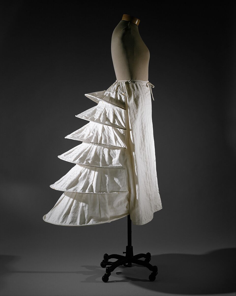 This 1871 bustle is made of metal wire fully encased in cotton fabric. Of the means employed to force the projecting hoops toward the back of the body, the most common were interior fabric tapes or a panel that lay against the back of the body. This solution was not unlike that used to create eighteenth-century panniers.