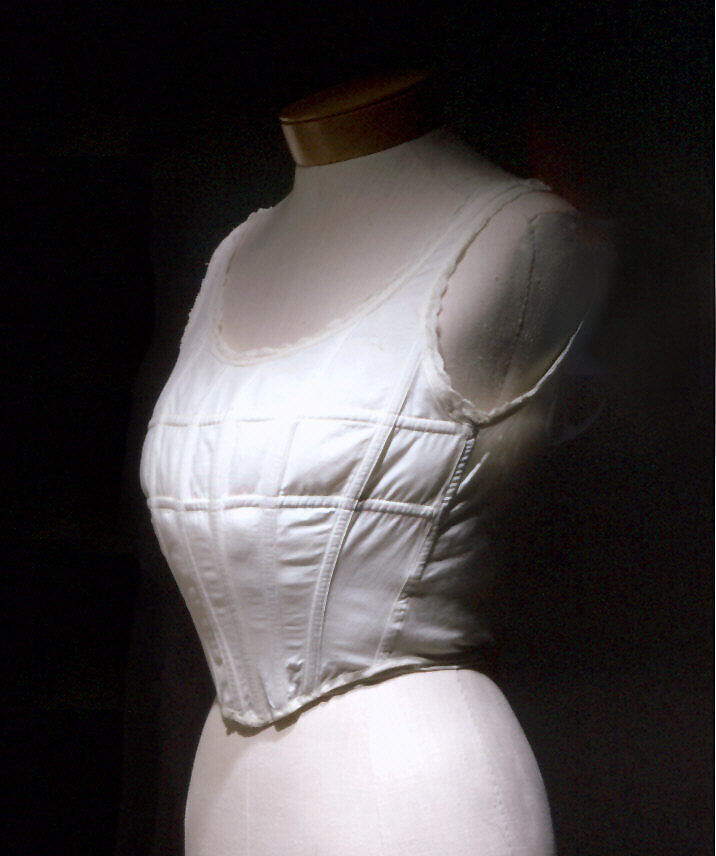 This corset cover reveals the ideal "monobosom" of the turn-of-the-twentieth-century silhouette. The support for the bust is set very low and there is no use of gussets beneath that might serve to articulate them as two separate entities.