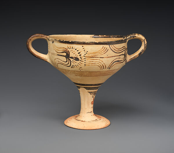 Stylized marine creatures decorate this kylix, a type of drinking vessel of the Mycenaeans that was typically associated with communal dining. Wall paintings decorating Mycenaean palaces show kylikes held by participants in celebrations and banquets, and archaeological evidence for feasting at these sites includes animal bones, conical cups, and kylikes. The palace at Pylos had shelves for storing an enormous number of these vessels, which furnished large banquets hosted by the local ruler.