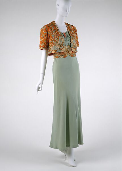Displaying a Chinoiserie delicately appropriated from the decorative arts, Drécoll's coral-orange bolero is worn atop her Western-style (but cheongsam- or qi-pao-related) column dress. The result is a Shanghai-like synthesis of East and West. By the 1930s, the frequent trade expositions in Paris had encouraged keen awareness of Chinese costume and arts among French fashion designers, including Grès, Lanvin, and Drécoll. Drécoll cleverly used the exoticism of the bolero to set the rank badges onto Western dress as a kind of acknowledged appliqué.